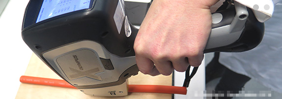 A clean piece of cable approximately 200mm in length is placed on a wooden jig and the XRF analyser is placed in direct contact with the sample.