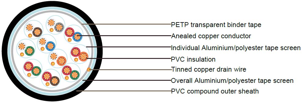 | Individual screen | Aluminium/polyester tape is applied over each pair metallic side down in contact with tinned copper drain wire, 0.5mm^2 |