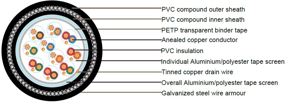 | Individual screen | Aluminium/polyester tape is applied over each pair metallic side down in contact with tinned copper drain wire, 0.5mm^2 |